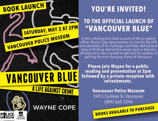 The Stormy Petrels are invited to a public reading, a first-hand account of life as a police officer, and book signing at The Vancouver Police Museum located at 240 E Cordova Street, Vancouver on Saturday, May 2nd at 2pm.