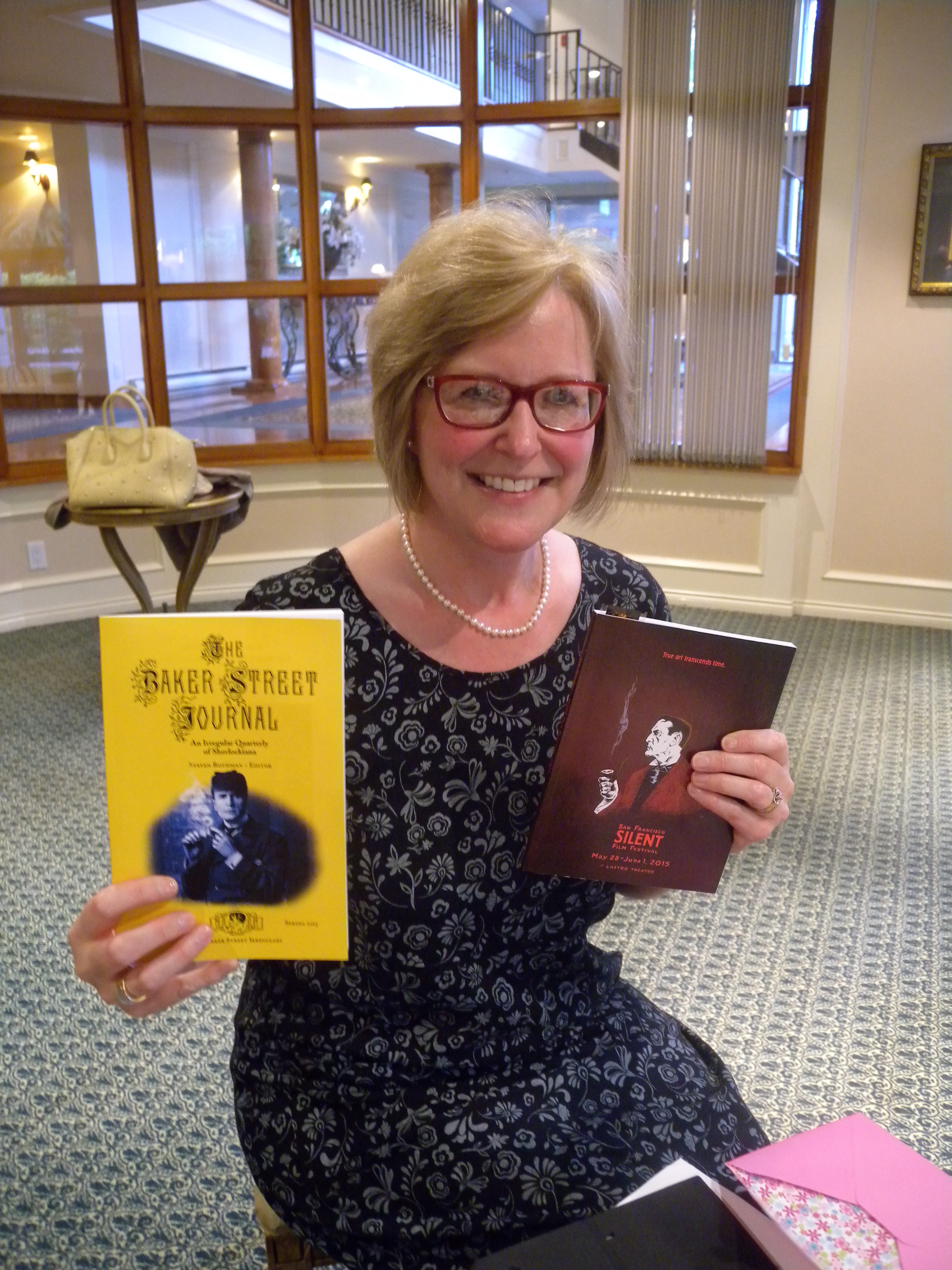 Twenty-one Stormy Petrels and guests were treated to a talk by Sonia Fetherston, BSI who happened to be in Vancouver. We were very delighted when she accepted our invitation to discuss the recently-restored silent William Gillette movie. A film that would impact Sherlockians 100 years later! Sonia had been to the debut screening of the restored film last May in San Francisco and was able to inform us about how it was made, lost, found and painstakingly restored. (The film was not found in one reel but several and had to be put into sequence. Also,the title cards were originally in French and had to be translated). The movie, based on the play “Sherlock Holmes” written by William Gillette and featured Gillette in the title role who had played Holmes 1,300 times on the stage, but this was the only time he played Holmes in film. Sonia was able to answer many questions, and her enthusiasm was definitely contagious! Several of our group, who were not familiar with William Gillette’s work and his impact on the Holmes image, were all very anxious to see the movie.
