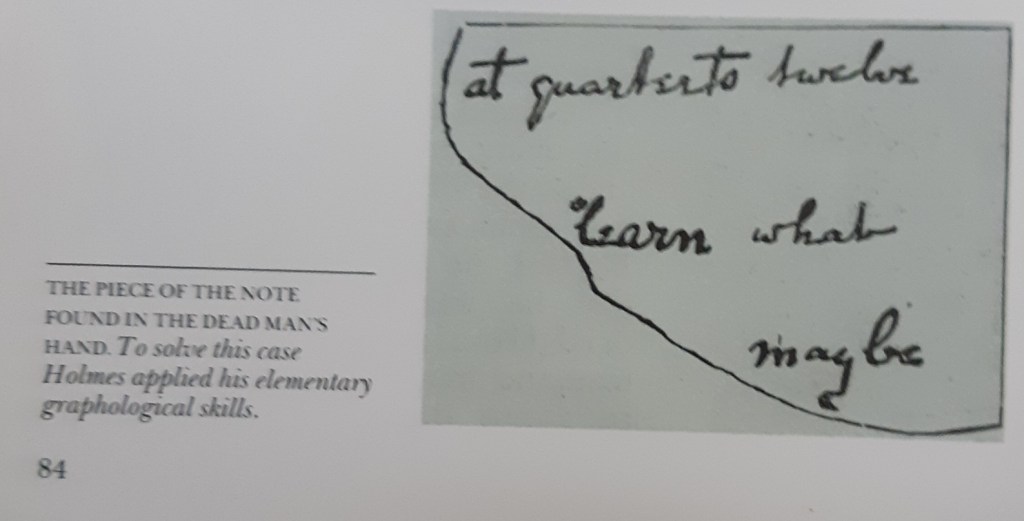 According to Richard Lancelyn Green’s essay in “The Baker Street Dozen”, this adventure was based on an article written by Alexander Cargill, a handwriting expert, and published in the Edinburgh Medical Journal” in 1890.